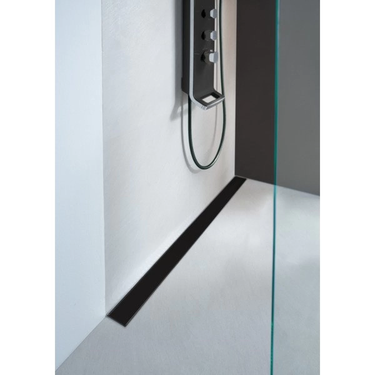 Showerline Standaard van ACO “Solid Black” met volledig zwarte afdekking en horizontale afvoer. Inbegrepen in de set is een flens voor waterdichte aansluiting onder het tegelniveau.