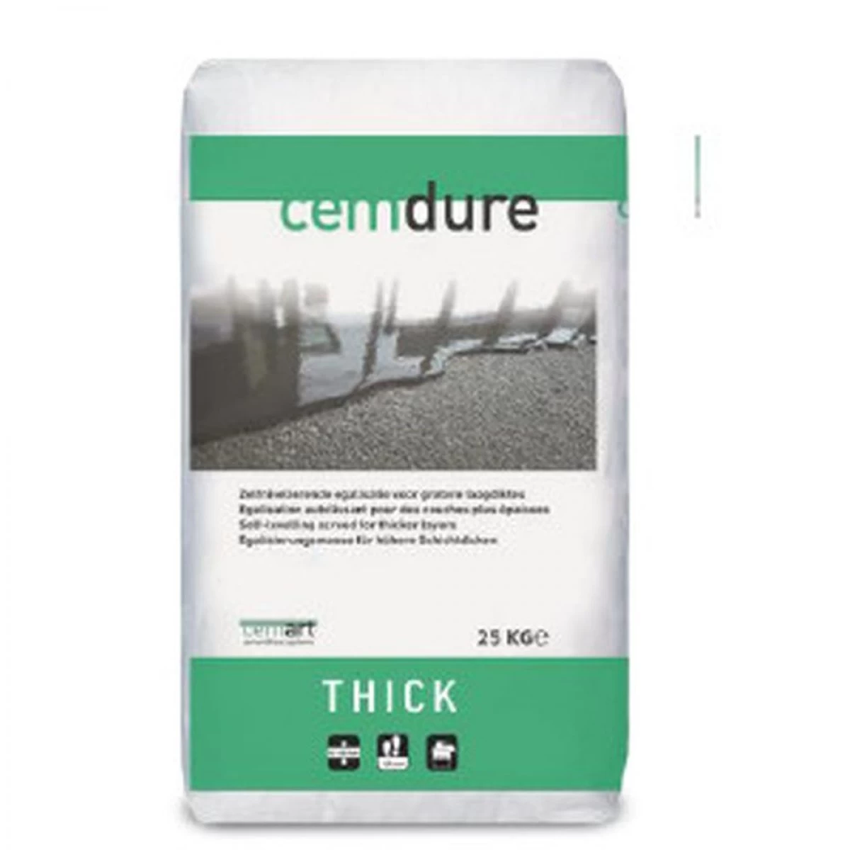 CEMDURE THICK is een zelfnivellerend cementgebonden en krimparm egalisatiemateriaal uit hoogwaardig aluminiumcement dat eenvoudig uitgestreken kan worden. Het is een voorgemengd droog poeder ontworpen voor de bevloering van woningen. Na toevoeging van water kan CEMDURE THICK zowel manueel als met een automatisch continue mengpomp (zonder wachtkamer) aangebracht worden.