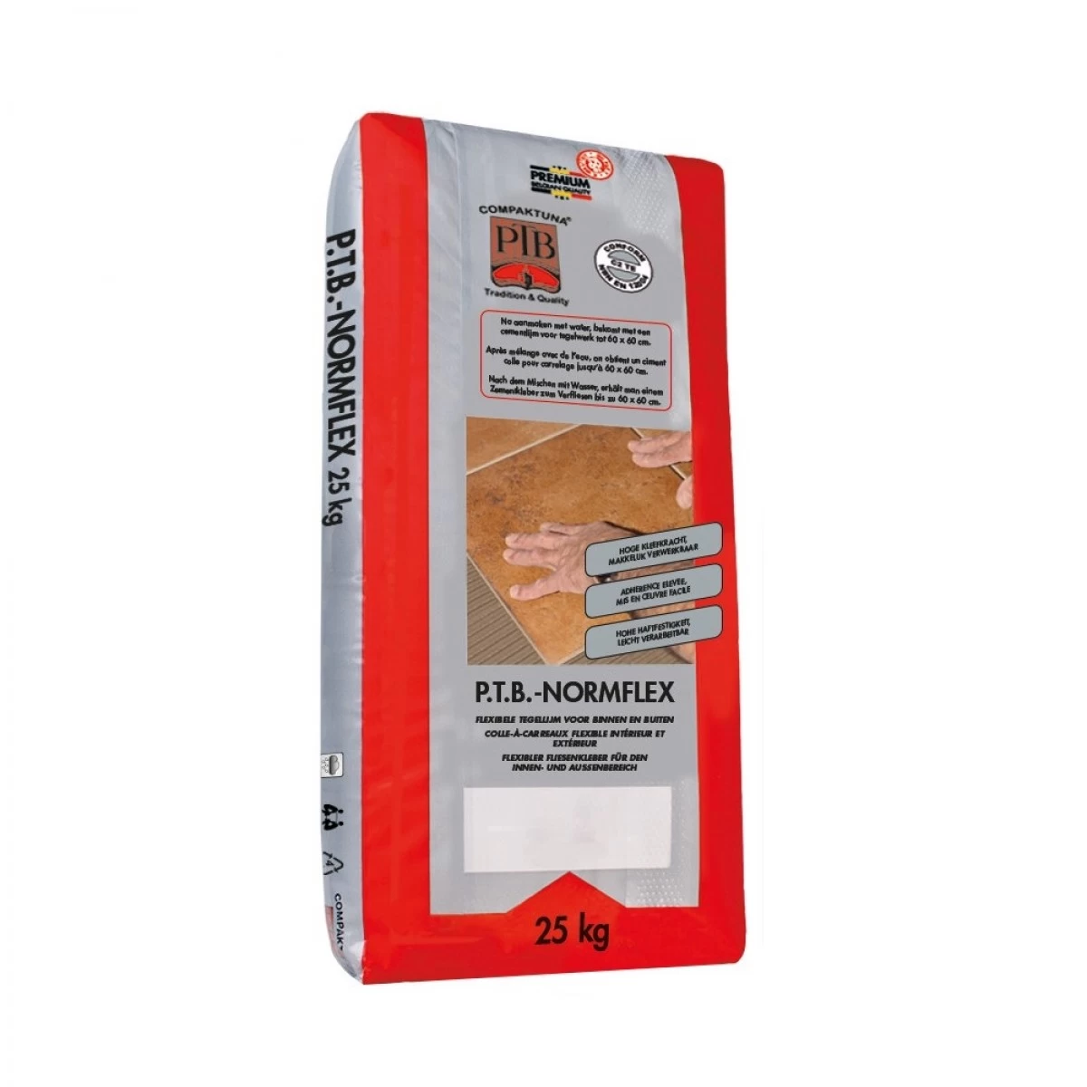 -NORMFLEX is een droge samenstelling die door eenvoudige toevoeging van water een gebruiksklare lijm geeft met een verhoogde flexibiliteit voor binnen en buiten. Voldoet aan de classificatie C2TE volgens NBN EN 12004 en draagt het CE label.