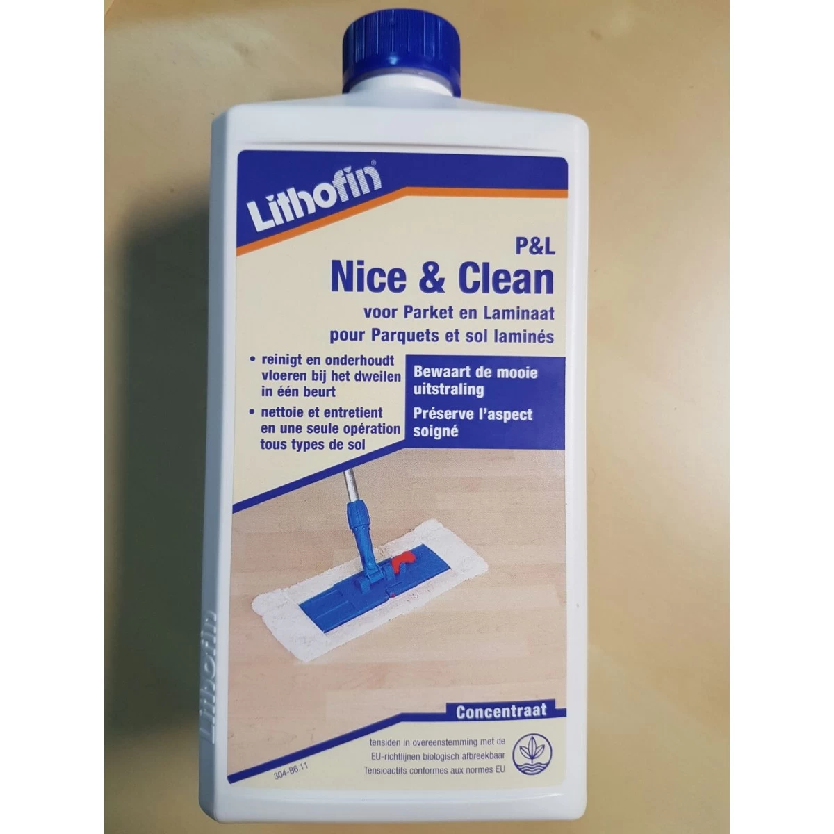 LITHOFIN P&L Nice & Clean voor dagelijks onderhoud reinigt en onderhoudt vloeren bij het dweilen in één beurt van parket, laminaat, kurkvloeren, kunststoffen en gelakte oppervlakten.