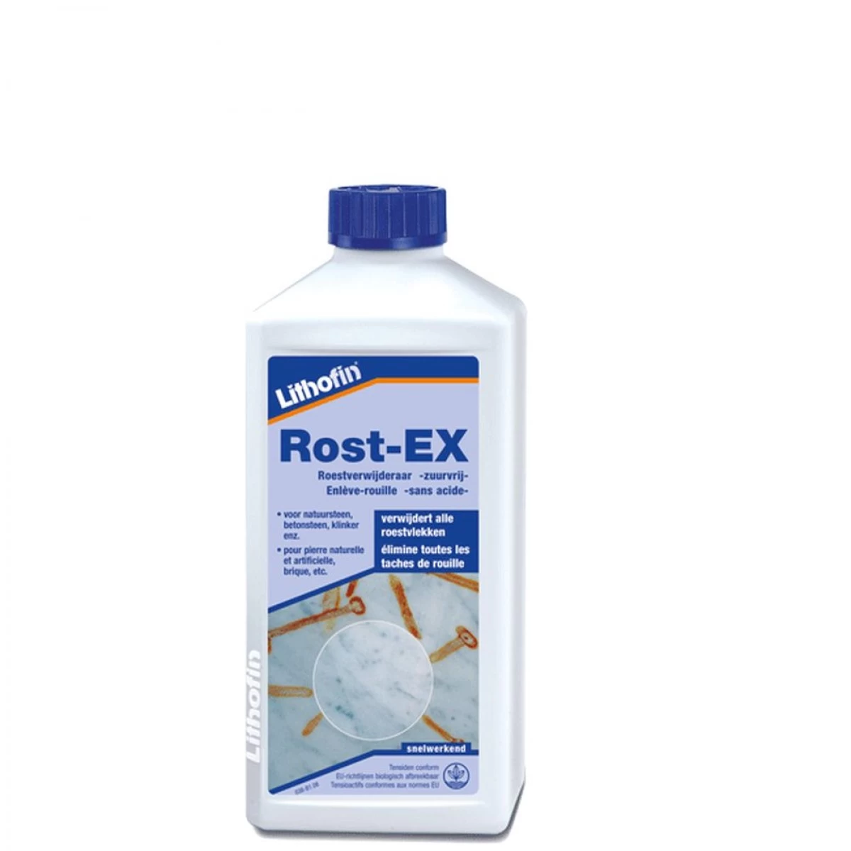 Lithofin rost-EX (500ml) is een reinigingsmiddel tegen metaalslijpsel, ijzerhoudende meststoffen, roestig water en andere roestvlekken op keramische tegels, natuur- en betonsteen, klinkers, zowel binnen als buiten.