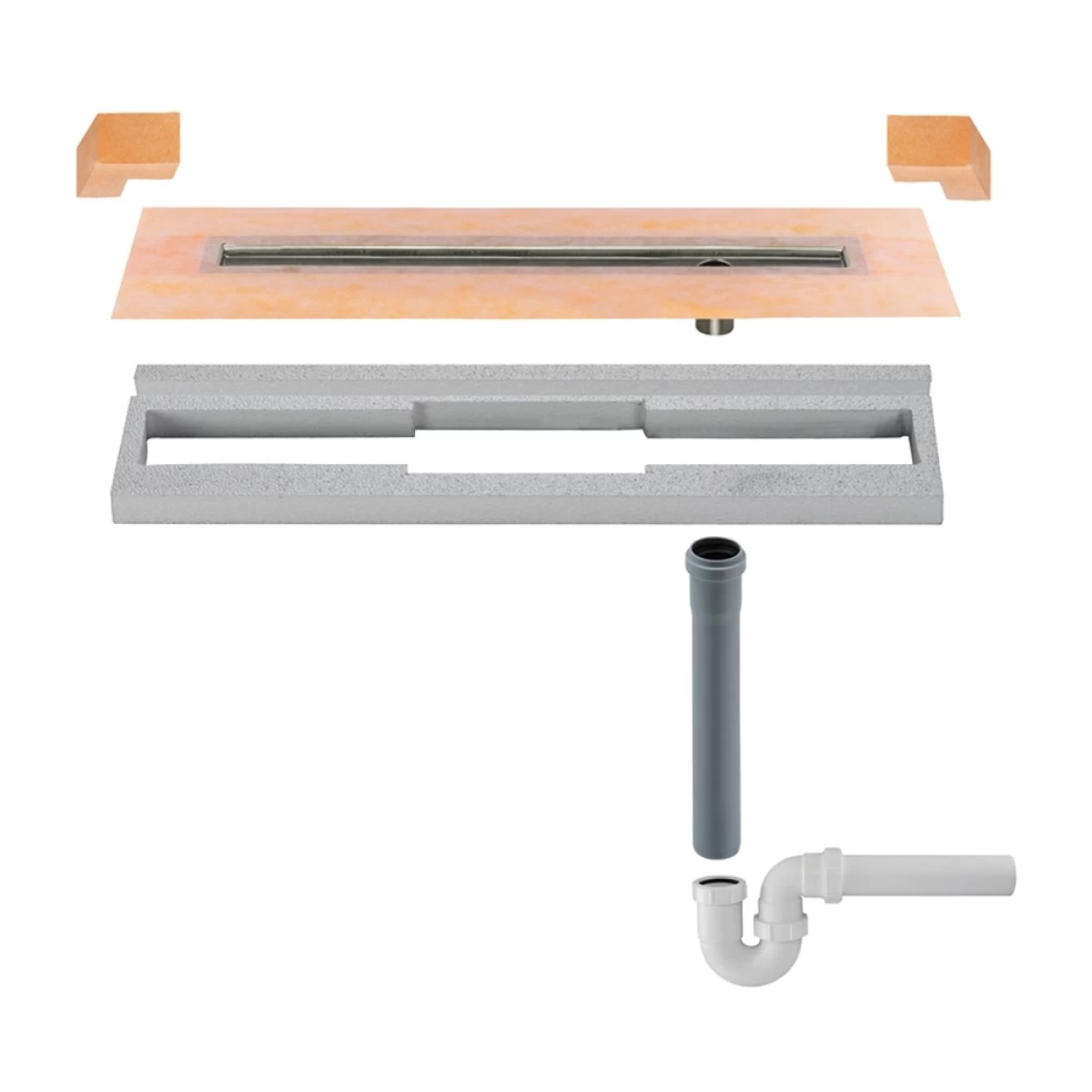 Schlüter KERDI-LINE VOS is een volledige set voor lineaire inloopdouches met een verticale afvoer en decentrale afvoer. Ze is universeel voor de centrale plaatsing of plaatsing tegen de wand. Op de rondom liggende kleefflens van de goot is een standaard voorziene manchet uit KERDI vastgelijmd. Deze dient voor de betrouwbare afsluiting van de goot op de contactafdichting, zowel op vloeren als tegen opgaande wanden.