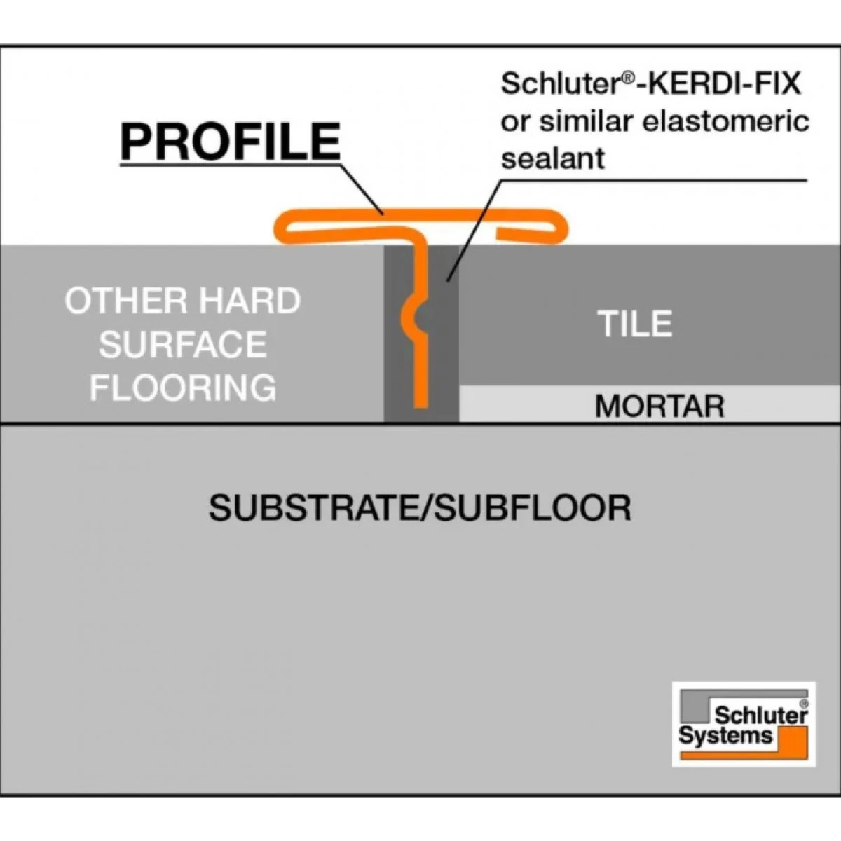 Schlüter®-RENO-T is een T-vormig verbindingsprofiel dat achteraf geplaatst kan worden als overgang tussen twee aan elkaar grenzende bekledingen.