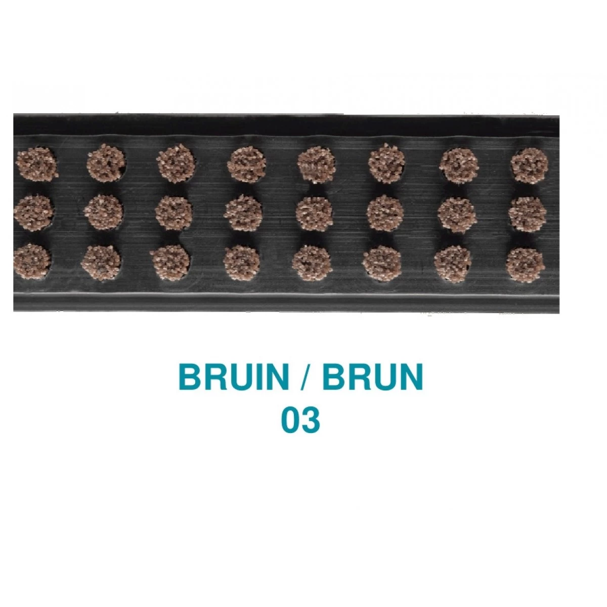 Deze Oprolbare voetmat, samengesteld uit een aluminium draagprofiel met een loopvlak uit gestanste borstels die het kleuraspect aan het loopvlak geven. Deze borstels staan in doorlopende rijen van 3 over het ganse loopvlak van de mat. De aluminium profielen zijn gescheiden door een zwarte PVC verbindingsstrook van 4 mm voorzien van evacuatiegaten. De aluminium profielen in natuurkleur zijn aan de onderzijde over de volle lengte voorzien van een geluidsisolerende celrubberprofiel.